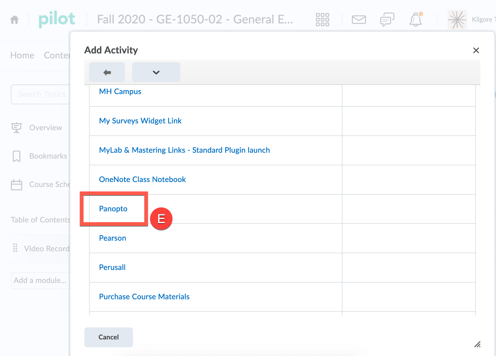 Add Panopto to your Pilot course (Note - this will take you to Brightspace's external website, which is another name for Pilot).