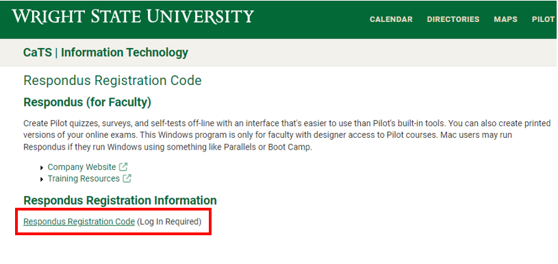 The registration code can be found by going to the CaTS Respondus Registration Code page, and click the “Respondus Registration Code” link. You will be prompted to log in using your Campus 'w' username and password, and then you will see the Installation Password listed on the next page.