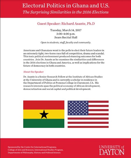The University of Dayton will be hosting Dr. Richard Asante, a Senior Research Fellow at the Institute of African Studies at the University of Ghana. His research interests span the political economy of African development, democratization, and social capital and political development.