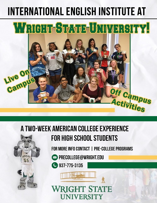 The international English Institute at Wright State University invites high school students for a Two-Week American College Experience. Please see flyer for more information.