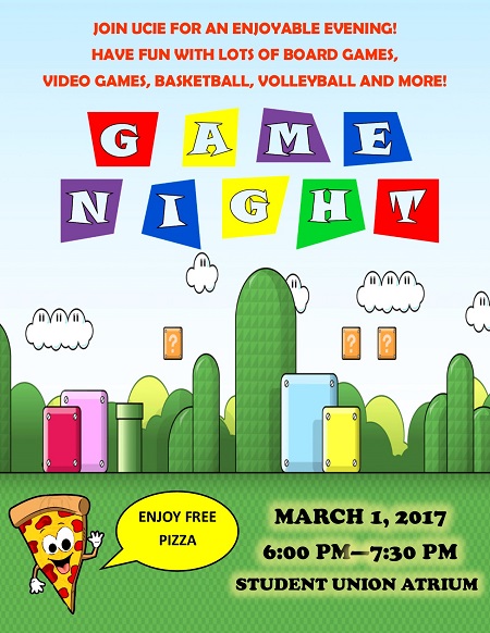 Enjoy free Pizza, video games, board games, volleyball, and more with friends at UCIE's Game Night!