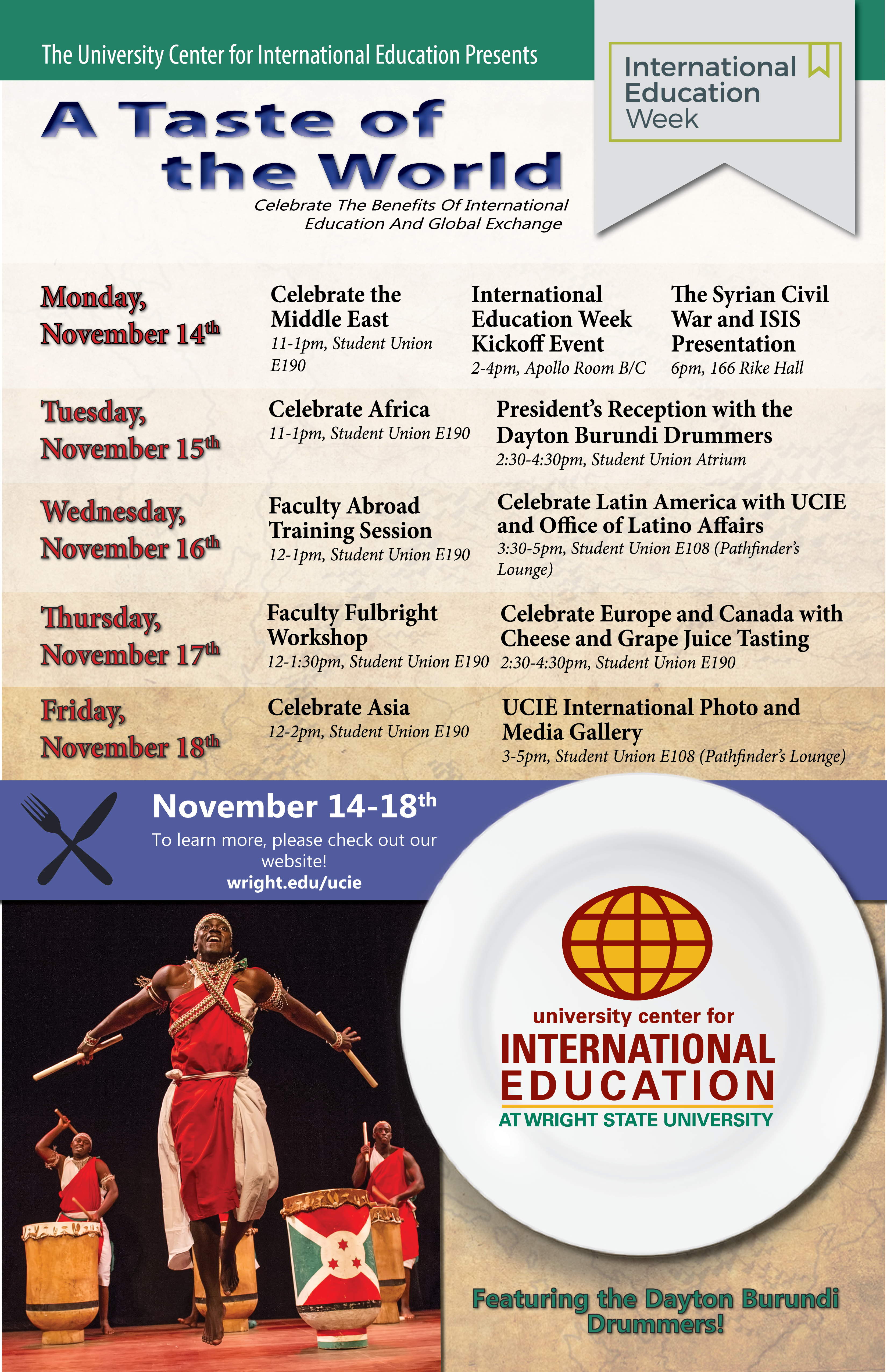 Every Fall, Wright State has an opportunity to recognize our international programs as part of International Education (IE) Week. November 14-18th marks the 18th anniversary of the annual celebration of international education and exchange worldwide. In the United States, it is coordinated jointly by the US Department of State and the US Department of Education. UCIE is honored to coordinate events for our Wright State students, faculty, and staff. This year, our theme is "A Taste of the World". Please join us for a variety of programs including an International Education Week Kick-Off Event, President's Reception with Burundi Drummers, a Fulbright Faculty Workshop, and several international meet and greets with different cuisines from around the world. Take a moment to vote or submit an entry for our International Photo Contest where winners will be announced during our International Photo Gallery on Friday, November 18th. Speaking of voting, international students have had opportunities to discuss democracy and voting in our UCIE Convo Club and Global Connections with presentations on comparative political systems. To climax this process, on November 4th our international students will have an opportunity to vote for their favorite US presidential candidate through a Mock Election as part of our weekly Global Connections. For a complete list of our all our events, check out www.wright.edu/international-education.