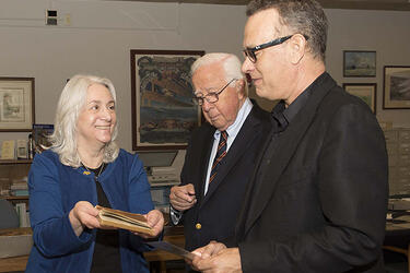 During their visit to campus, Hanks and McCullough toured the archives and examined rare Wright artifacts that are part of the university’s “Wright Brothers Collection,” one of the most complete collections of Wright material in the world. The collection includes the Wrights’ own technical and personal library, family papers and other documents detailing the lives and work of Wilbur and Orville Wright and the Wright family.