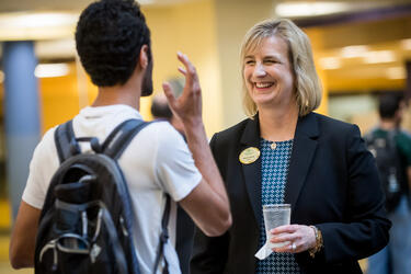 Schrader, who began her term as Wright State’s seventh and first female president July 1, made her remarks July 6 during a welcome reception in the Atrium of the Student Union attended by about 400 students, faculty, staff and community leaders.