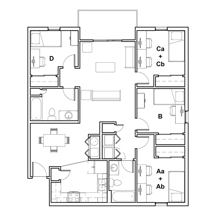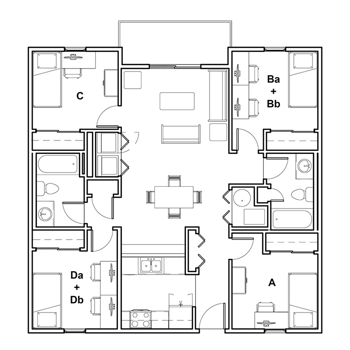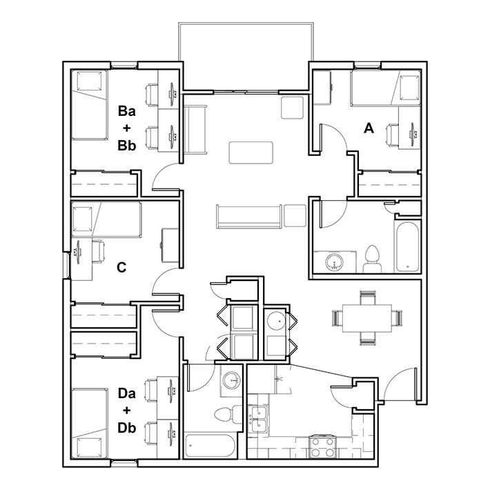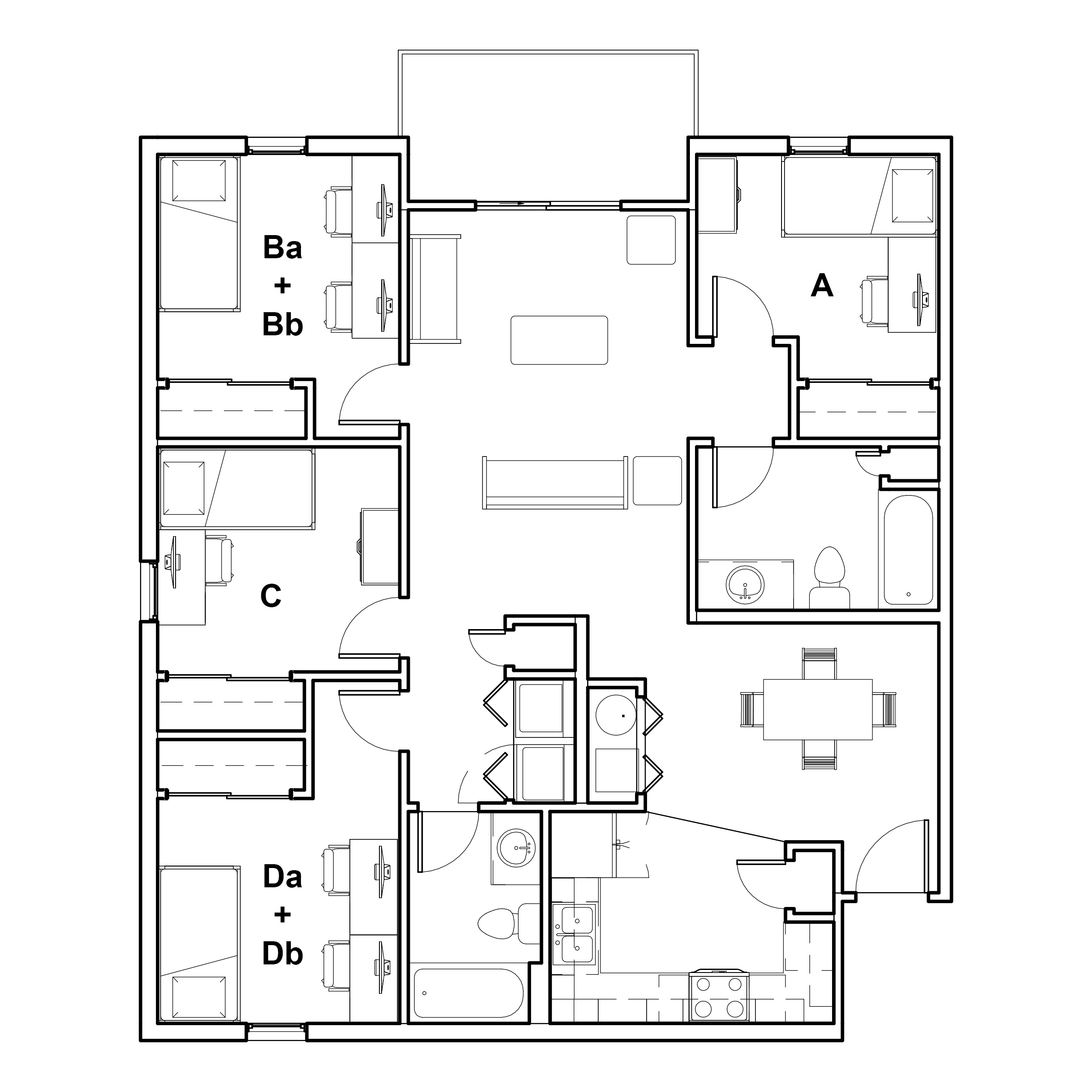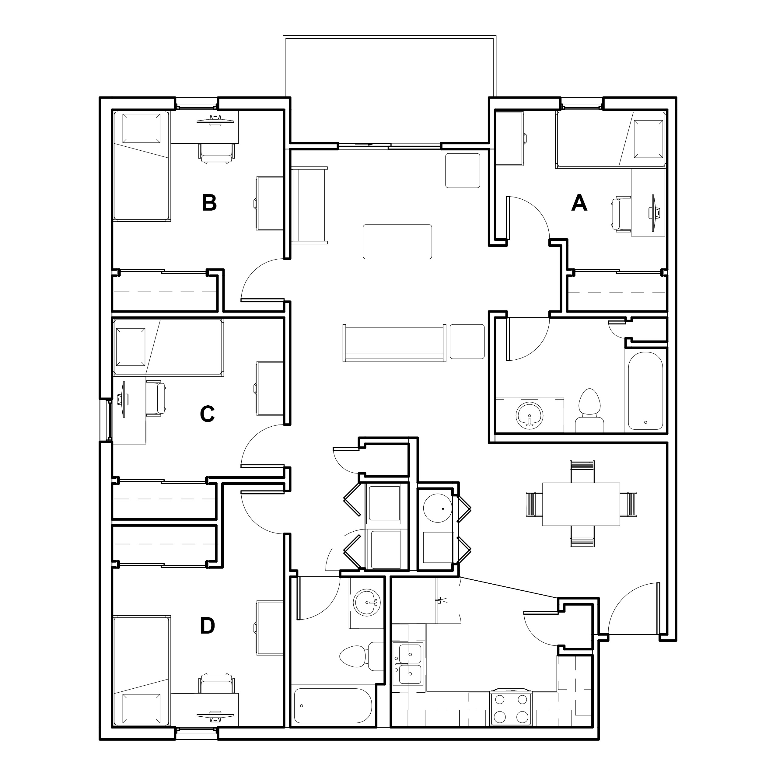 Students per bedrooms: two double occupancy bedrooms and one single occupancy bedroom in each 6-Person Quad (6 people)