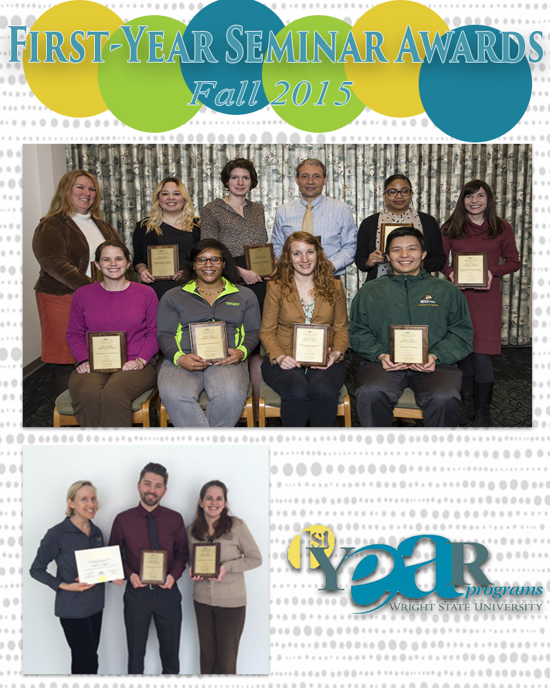 The First-Year Seminar Awards on March 10, 2016, recognized eleven special award recipients honored for their work in fall 2015 First-Year Seminars (FYS) at Wright State University. Photos of “Fysie” recipients can be viewed on wrightstate.smugmug.com. Peer mentor Hunter Cregger participated in a spring internship with a CPA firm and was held captive by tax season until after April 15. As shown below, First-Year Seminar Award recipients are: