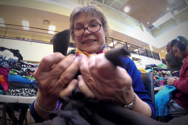 Fleece blankets for sick and traumatized children were cut, tied and labeled by Wright State students, faculty and staff on March 30 in the Student Union Atrium.